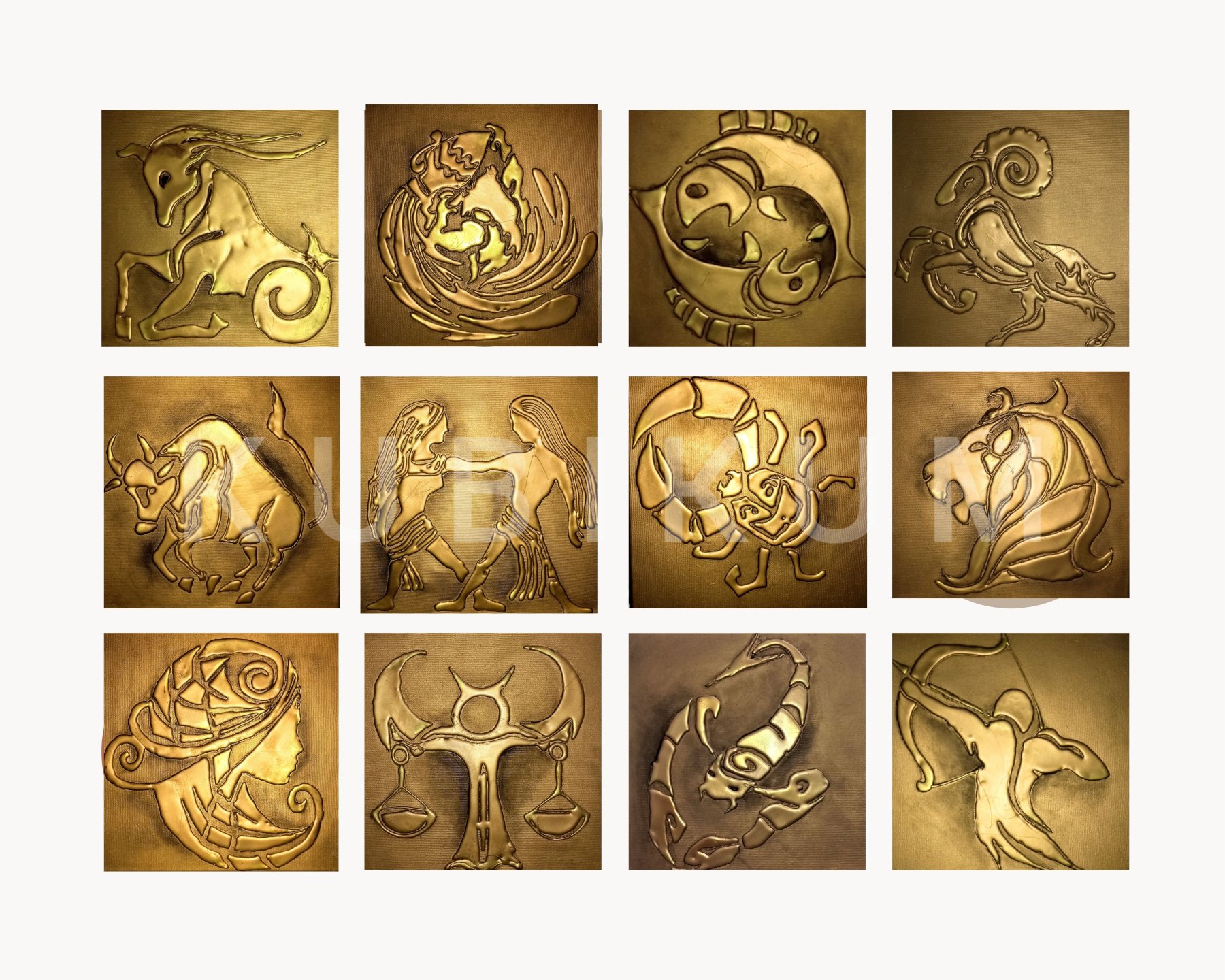 12 znamení zverokruhu - Vodnár, Ryby, Baran, Býk, Blíženci, Rak, Lev, Panna, Váhy, Škorpión, Strelec a Kozorožec. Obraz 130 x 100 cm ak by ich bolo na stene všetkých 12.